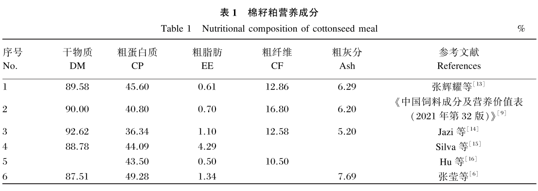 棉籽粕在肉牛上的报道主要集中在生长性能、瘤胃发酵特性和消化率等方面。宫晨[39]用2%棉籽粕、1.8%玉米干酒糟及其可溶物(DDGS)和1.2%味精渣混合替代饲粮中5%豆粕饲喂鲁西黄牛,对其生长性能、血液指标和营养物质表观消化率无不良影响,平均每千克增重成本降低0.29元,提高了养殖效益。荆元强等[40]研究发现,等蛋白质水平下,用棉籽粕全部或部分替代豆粕对肉牛日增重及各项屠宰性能指标的影响均不显著但棉籽粕的饲粮单价、肉牛每千克增重成本都低于豆粕,每千克增重成本分别降低了0.49和0.68元。Srinath等[41]研究表明,用棉籽粕替代100%豆粕饲喂肉牛对其表观消化率、瘤胃发酵特性和微生物组成没有显著影响。Leite等[42]报道,在放牧肉牛饲粮中补充30%棉籽粕可以提高放牧肉牛的表观消化率、日采食量和氮利用率。此外,也有研究报道,棉籽粕对肉牛的甲烷(CH4)排放和免疫功能也具有一定的正调控效应。在雨季饲养阶段,饲粮中添加0.3%体重的棉籽粕不会对放牧肉牛的瘤胃参数和肠道CH4排放造成明显的影响而且使得平均日增重提高了15.56%[43]。张晓明等[44]研究表明,饲喂以棉籽粕为蛋白质的饲粮,肉牛增重净能最高(棉籽粕组22.00MJ/d,豆粕组18.95MJ/d,菜籽粕组21.38MJ/d),CH4排放量最低,相比于豆粕降低了32.79%,在肉牛育肥后期可以用棉籽粕替代豆粕以降低成本。Zhu等[45]在冬季给育肥肉牛饲喂蛋白质水平为10%和14%的棉籽粕饲粮,后者平均日增重、瘤胃微生物蛋白含量和粗蛋白质消化率分别提高了40.91%、8.14%和3.70%,且降低了血清中丙二醛、肿瘤坏死因子-α的含量。