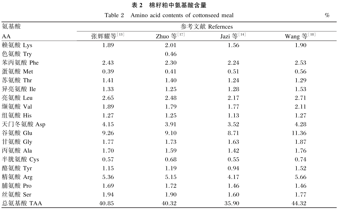 棉籽粕具有丰富的营养成分,可与绝大多数蛋白质类杂粕相媲美。棉籽粕营养成分见表1,造成表中营养成分差异的原因可能与棉籽粕品种、种植地域及榨油工艺等因素有关。棉籽粕中氨基酸种类也比较全面,富含17种氨基酸,棉籽粕中氨基酸含量见表2。此外,棉籽粕中还含有钙、硫铁、铜等多种矿物元素和维生素E,对动物的生长发育起着重要作用[6]。