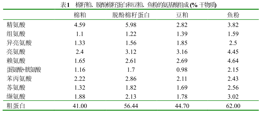 脱酚比较彻底,保证了饲用安全性,有效提高棉籽的利用价值。薛敏等(2003)以5.54g的鲤鱼为实验对象,用间接法(7:3法)研究鲤鱼对脱酚棉籽蛋白(粗蛋白含量50%以上)和豆粕(44%粗蛋白)的干物质、蛋白质、能量和氨基酸表观消化率。结果显示,鲤鱼对脱酚棉籽蛋白的消化利用率高于豆粕,干物质、粗蛋白、能量和总磷消化率也均明显高于豆粕,脱酚棉籽蛋白的缬氨酸和精氨酸消化率显著高于豆粕,