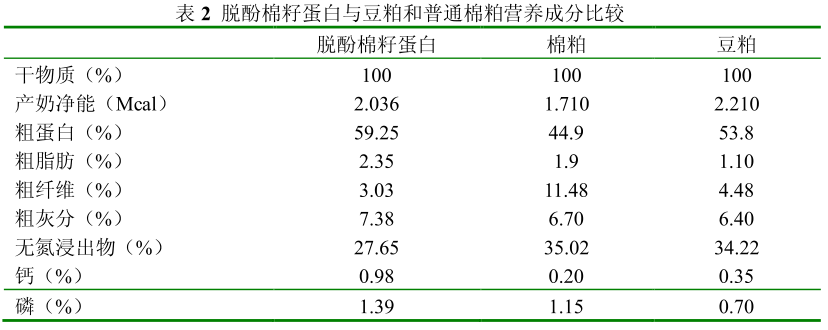 脱酚棉籽蛋白蛋白质含量超过豆粕或与其相当,而高于棉粕和其他植物性蛋白来源的饲料,与普通棉粕相比(表2),粗蛋白(CP)含量和产奶净能(NEL)分别提高了31.95%和19%,豆粕(饼)、棉粕(饼)、葵粕、菜粕和胡麻粕的粗蛋白含量分别为40%~45%、36%~45%、30%~33%、33%~37%和31%~33%(周建民,2003)。