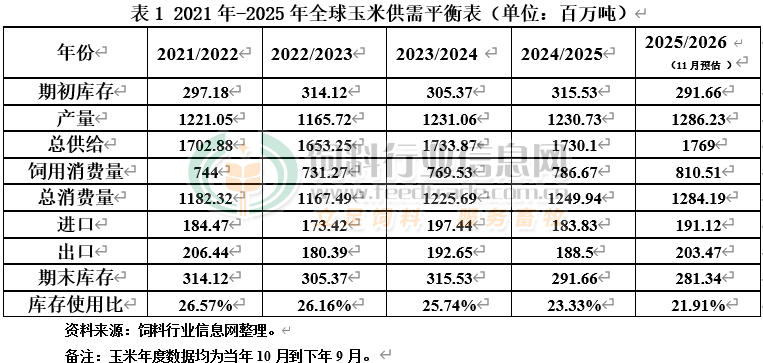 2025年11月14日美国农业部发布供需报告,对2024/25年度美国玉米供需进行调整:产量略有上调,饲料行业用量大幅调低。本月将美国2024/25年度玉米产量调高2500万蒲至148.92亿蒲;用于饲料生产的玉米用量调低1.83亿蒲至54.92亿蒲;乙醇行业的玉米用量调高100万蒲至54.36亿蒲。期末库存调高800万蒲至15.32亿蒲。