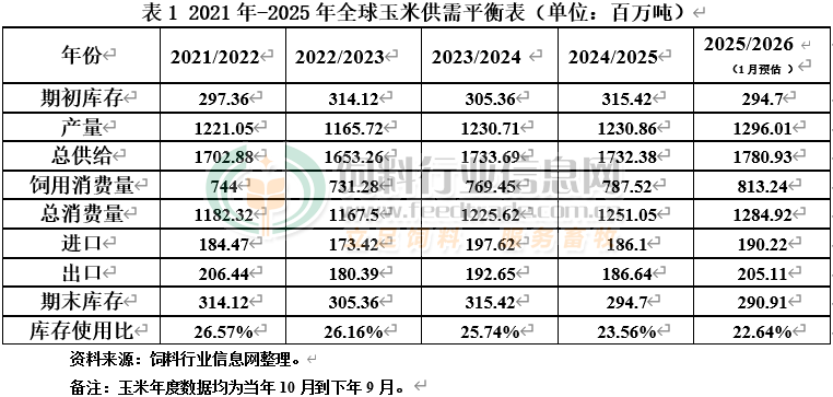 2026年1月12日美国农业部发布供需报告,对2025/26年度美国玉米播种面积、单产、产量、期末库存有所上调,食品、种子和工业(FSI)用量下调。本月将2025/2026年度美玉米播种面积预估为9880万英亩,较12月预测上调10万英亩;2025/26年度玉米收割面积预估为9130万英亩,较12月预测上调130万英亩;2025/2026年度美玉米单产维持至186.5蒲式耳/英亩,较12月份预测上调0.5蒲式耳/英亩;2025/2026年度美玉米产量上调至170.21亿蒲式耳,较12月份预测上调2.69亿蒲。2025/2026年度美国玉米总用量上调9000万蒲至164亿蒲。饲用及其他用量上调1亿蒲至62亿蒲;2025/2026年度美玉米出口预估维持至32亿蒲,与12月预测一致;2025/2026年度美玉米期末库存上调1.98亿蒲,至22.27亿蒲。