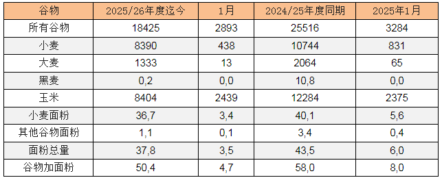 1月1-28日的谷物出口量为289万吨,低于去年同期的328万吨。