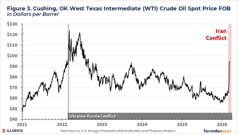 当前中东冲突推高了能源和化肥价格。对玉米和大豆价格的影响则更难确定。本文分析了自2月28日美国和以色列开始空袭以来的价格走势。成本的总体影响将取决于冲突的持续时间。特别是,如果霍尔木兹海峡长期关闭,或者伊朗的长期石油产量严重下降,能源和化肥价格可能会进一步上涨。虽然2026年的许多投入品已被采购,但今年的盈利前景可能有所下降。成本上涨的影响也可能持续到未来几年。