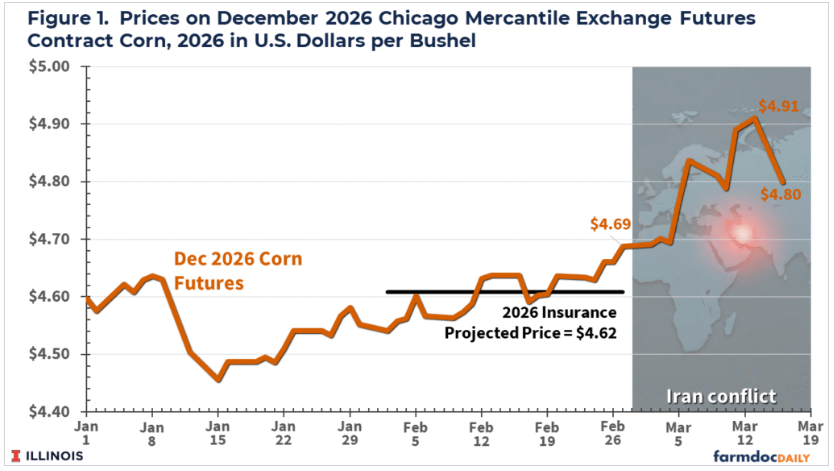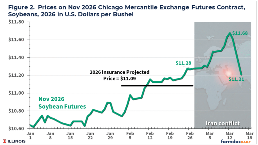 玉米和大豆的收获期期货合约价格能够很好地反映收获时的预期价格水平。自2月27日以来,玉米和大豆价格均有所上涨,随后在3月16日出现大幅下跌。2月27日,芝加哥商品交易所2026年12月玉米期货价格为每桶4.69美元。自2月27日以来,玉米价格总体呈上涨趋势,3月13日达到每桶4.90美元,较2月26日上涨0.31美元(见图1)。