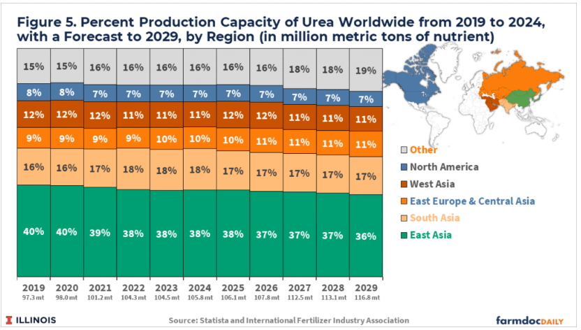 中东是天然气的重要产地,而天然气是氮肥生产的原料。全球约10%的尿素产自中东(见图5)。中东地区的动荡局势会对氮肥和磷肥的生产产生重大影响。