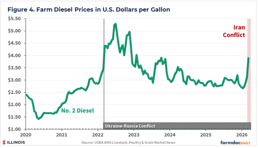 原油价格上涨正在转嫁到农民身上。伊利诺伊州农业市场服务局在其3月6日发布的伊利诺伊州生产成本报告中指出,柴油价格为每加仑3.90美元,较之前的每蒲式耳3.14美元上涨了0.76美元(见图4)。如果原油价格继续上涨,柴油价格可能超过每加仑4.50美元,与上次原油价格超过每桶120美元时的水平类似。