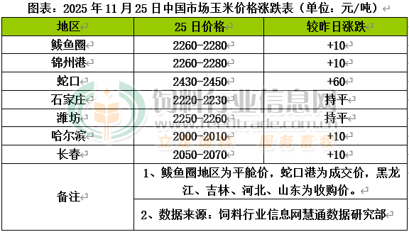 国内主产区玉米价格走势呈区域性分化,东北区域铁路运力偏紧市场看涨情绪升温,销售进度依旧偏慢,整体价格继续偏强;华北产地持粮主体的出货积极性明显提高,玉米到货量快速增加,部分用粮企业顺势下调收购价。东北产地玉米价格上涨,多数产区发北港已顺价,北方港口集港量相对回升,玉米库存继续上升至130万吨以上,上周下海量约100万吨左右。发运需求旺盛支撑北港价格保持强势。南方港口进口玉米库存35万吨,进口替代谷物库存约100万吨。进口大麦仍具有饲用性价比优势,饲料企业积极采购。受北港收购价格大幅上涨,现货供应趋紧,贸易商报价走强。国内玉米现货价格基本稳定,局部小幅上涨。东北产区随着气温下降,玉米易于存储,基层种植户售粮积极性暂不高,挺价意愿较强,内蒙古、吉林、辽宁上货量仍显一般,铁路货运再度收紧,市场心态整体偏积极, 烘干塔存粮积极性不高,对市场保持谨慎观望的态势,供应压力逐渐向深加工企业集中,深加工企业维持按需采购,收购价格继续偏强。华北黄淮产区东北粮价格上调和物流受限,调入量大幅减少,而气温回落利于本地新粮存放,基层种植户看涨情绪偏强,惜售情绪仍存,市场粮源供应依然相对紧张,企业收购价格不断上调,种植户出货积极性略增,厂门到货量激增导致用粮企业议价能力增强,报价开始回落。