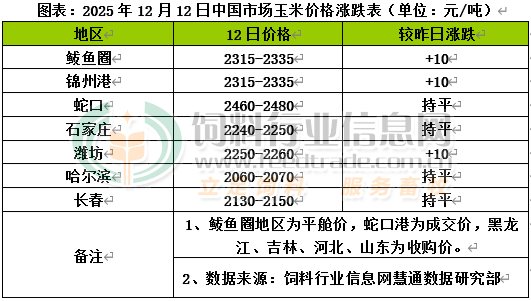 国内主产区售粮进度已达四成,受新一轮寒潮天气影响物流不畅,售粮节奏有所放慢,市场流通量减少,加工企业到货不足,收粮难度上涨,部分企业收购价格开始涨价促量。北方港口寒潮来临,上量较前期高峰期明显减少,船期比较多,贸易商收购积极,为了刺激到货量增贸易商收购价格小幅上调。南方港口内贸玉米库存逐渐增多,进口谷物价格相对便宜,内贸玉米优势有所下降,企业库存处于安全水平以上,高价建库相对谨慎。国内玉米现货价格基本稳定,局部小幅回升。东北产区部分种植户租金到期,种植户变现积极性转强,贸易商也面临第三方资金到期的压力,市场看涨气氛较前期有所降温,持粮主体售粮积极性略有提升,基层粮源上量有所增加,加工企业库存也逐步增加,继续提价采购积极性减弱,收购价格稳中有跌。华北黄淮产区受寒潮天气影响,多地出现中雪或大雪天气,物流运输受限,售粮节奏有所减慢,玉米发运减少,优质粮源流通量少,饲料企业库存维持高位,维持刚性采购,深加工企业到货不足,收购价格逐渐由跌转涨。