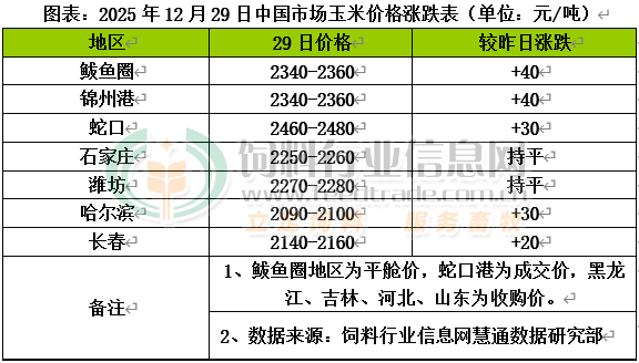 国内主产区基层惜售情绪仍在,玉米供应有增但仍不及预期,期货盘面拉升带动市场看涨情绪,饲企节前有所备货,提振局部价格偏强。北方港口作业和锚地船期仍存,但近来集港量下降明显,贸易商收购价格有所上调。期货市场反弹对港口行情也有一定的支撑。南方港口到货成本高企,且优质粮数量有限,临近年底终端饲企采购量增加,对价格上涨有所支撑。国内玉米现货价格基本稳定,局部小幅上涨。东北产区基层整体售粮进度四成多,其中辽宁售粮进度六成半多,吉林售粮进度三成半多,黑龙江售粮进度四成多,内蒙古售粮进度约四成。进口玉米拍卖持续放量,对市场供应有所补充,玉米上量有限,部分地区中储粮直属库已停止收粮,贸易利润倒挂导致外流销售不畅,本地需求有限,下游企业库存继续提升,采购以刚需为主,个别企业收购价上调。华北黄淮产区基层整体售粮进度约四成,其中河南售粮进度四成半多,山东售粮进度约四成,河北售粮进度三成多,山西售粮进度三成多。基层种植户出粮积极性略有回升,持粮主体对出售优质粮源观望心态浓厚,下游产品走货缓慢,加工企业高价补库意愿低迷,收购价格小幅调整。