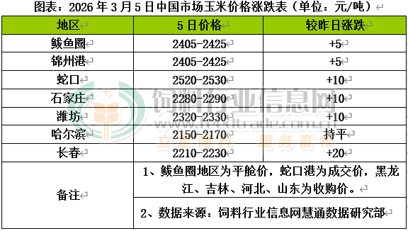 国内期货盘面拉升现货市场看涨情绪,基层上量恢复缓慢,持粮主体惜售心态增强,阶段性供应持续偏紧,加工企业和贸易商补库需求也不断释放,推动价格走高。天气因素影响东北产地玉米上量,市场购销尚未完全恢复,北方港口集港量相对一般,贸易商收购价小幅跟涨。南方港口饲料企业观望心态较浓,对高价玉米采购需求偏弱,贸易商出货偏慢,到港成本支撑报价相对坚挺。据悉,本月下旬将有巴西玉米集中到港,数量超过100万吨,对市场供应形成补充。国内玉米现货价格基本稳定,局部小幅走高。东北产区迎来大范围雨雪天气,基层种植户售粮活动受限制,加之基层余粮减至3成以内,种植户挺价待涨心态转强,市场有效供应偏紧,贸易主体也入市收购,加工企业有一定的补库需求,部分企业玉米收购价格仍在上调。今日中储粮采购发力,其中黑龙江采购玉米1.5万吨,吉林采购5.2万吨,辽宁采购约6万吨。政策粮收购对市场价格形成托底效应。华北黄淮产区春节期间加工企业库存进一步消耗,当前多地企业库存天数已不足一个月,玉米刚需采购增多,而持续雨雪天气以及基层售粮节奏偏慢,易商出货也较谨慎,企业厂门到货量维持低位,价格重心继续上移。
