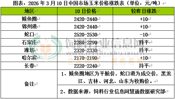 国内主产区气温逐渐升高,基层余粮储存难度增加,叠加玉米价格持续走高,种植户及持粮主体售粮变现积极性提升,中储粮轮入玉米也明显增多,市场底部支撑偏强。北方港口集港数量较前期有所增加,但产地涨价带动集港成本上扬,贸易商提价促收意向增强,收购价格小幅上涨。南方港口内贸玉米与进口到货累加,总库存从低位区间回升。上周谷物周度到货44.5万,周度走货51.1万吨。受期货盘面及北港成本上涨提振,贸易商报价跌幅有限。国内玉米现货价格基本稳定,局部小幅调整。东北产区基层余粮不足三成,随着气温回升及现货价格上涨,基层余粮逐渐释放,部分贸易商也获利出货,加工企业节后开机率小幅上升,下游整体需求尚可,为保障正常开机收购价格维持偏强运行。9日中储粮投放粮源全部成交,局部溢价幅度大,继续对市场供应进行补充。华北黄淮产区随着气温飙升新粮储存风险加大,基层购销有所恢复,贸易商建库需求有所恢复,加工企业厂门到货尚可,以本地货源为主,收购价格大体稳定,局部地区小幅波动。