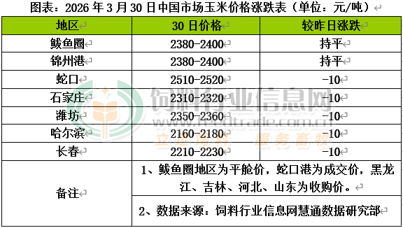 2026年3月30日大连商品交易所(DCE)玉米期货主力合约c2605开盘价2370元/吨,收盘价2346元/吨,跌22元/吨,结算价2368元/吨,最高价2373元/吨,最低价2345元/吨,总成交量689138手,持仓1052641手。