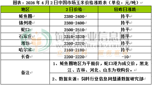 国内天气转暖叠加种植户春耕需求,基层余粮持续释放,粮源已向贸易环节转移,在收购成本支撑下贸易主体挺价意愿强烈,下游企业库存同比偏低,维持刚需采购,价格继续高位震荡。东北产地出货意愿增强,北方港口集港数量继续增多,处于偏高水平,而南北发运利润倒挂,贸易商按订单出货,港口库存持续累积。南方港口玉米库存58.4万吨,玉米到货船期增加,饲料企业高价补库意愿弱,受到货成本支撑贸易商报价趋稳。国内玉米现货价格基本稳定,局部小幅波动。东北产区到了新季播种前期,基层余粮释放速度加快,受陈化稻谷拍卖传闻影响,持粮贸易商出货意愿增加,随着潮粮出售进入尾声,持货贸易商挺价心态有所升温,深加工企业库存同比偏低,日常收购随行就市,还在中储粮及粮库处签订远期合同。有传闻称4月初将启动稻谷定向投放,总规模或达2000万吨(其中黑龙江1500万吨,其他省份500万吨),预计1500万吨糙米转饲作用,拍卖底价为1490元/吨。华北黄淮产区近日来受降雨天气影响,基层玉米上量受到限制,企业厂门到货明显减少,收购价格止跌回升,天气好转后市场购销逐步恢复,种植户存在卖粮变现需求,上量恢复性增加,加工企业根据到货情况调整收购价格。4月1日最低收购价小麦计划销售800588吨,成交644198吨,成交率80.47%;最高价2470元/吨,最低价2320元/吨,成交均价2374元/吨,周比下跌24元/吨。本轮最低价小麦拍卖成交率和溢价周比下降,参与主体竞拍热度降温,饲用需求仍在,但比价优势不明显,饲料企业大规模建库意愿不强。