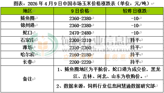 国内主产区贸易商心态松动,持续变现出货,养殖亏损持续扩大,饲企采购极为谨慎,深加工企业按需采购,叠加小麦及进口谷物替代优势凸显,继续压制价格窄幅偏弱。天气好转基层余粮持续释放,北方港口集港量略有增多,南北发运利润倒挂存续,下游刚需补库为主。南方港口内贸玉米库存53.7万吨,进口玉米15.2万。饲企观望心态增强,随用随采为主,市场成交不畅,贸易商报价小幅走弱。国内玉米现货价格基本稳定,局部小幅下跌。东北产区进入4月政策性玉米收储逐步进入收尾阶段,玉米采购数量明显减少。谷雨以后,东北将陆续进入春播工作,余粮收购进入尾声,潮粮所剩不多,烘干塔出货意愿较低,贸易商出货意向相对一般,深加工企业库存同比偏低,持续挂牌收购以保证生产,收购价格调整有限。华北黄淮产区近日来持粮贸易商惜售心态松动,出货意愿提升,市场供应量增加,深加工企业库存得到有效补充,按需收购为主,收购价格持续下跌,而基层余粮不多,贸易商挺价意愿偏强,出粮积极性降温,加工企业厂门到货明显减少,收购价格窄幅调整。8日最低收购价小麦竞价销售出小幅回暖的态势,计划销售801020吨,成交674362吨,成交率84.19%。最高价2490元/吨,最低价2320元/吨,成交均价2382.7元/吨,成交率84.19%。小麦已经具备一定的价格优势,饲料企业使用小麦替代玉米比例小幅上升,占比在25%-30%之间。