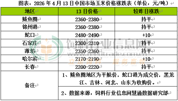 2026年4月13日大连商品交易所(DCE)玉米期货主力合约c2605开盘价2374元/吨,收盘价2373元/吨,跌3元/吨,结算价2376元/吨,最高价2388元/吨,最低价2367元/吨,总成交量514061手,持仓716594手。
