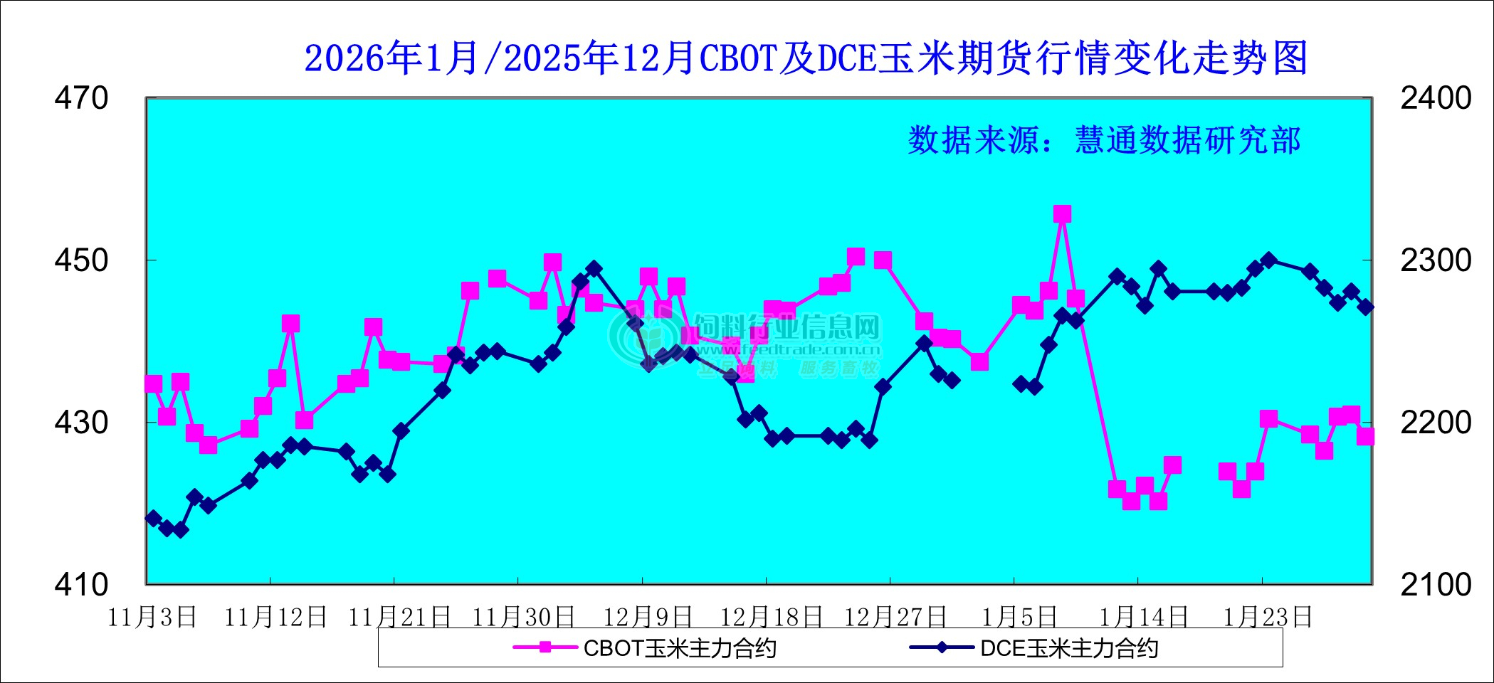图表:2026年1月CBOT玉米及DCE玉米期货市场行情变化走势图(单位:美分/蒲式耳,元/吨)