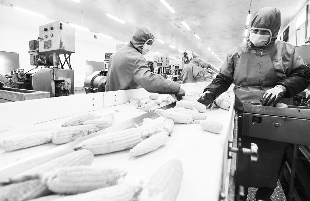 石家庄晋州市大力推动农产品深加工产业的发展,促进农业产业提质增效,农民增收,为经济高质量发展注入强劲动力。图为12月18日,在河北晋州经济开发区的河北鹏达食品有限公司农产品加工车间,工人在进行玉米加工。