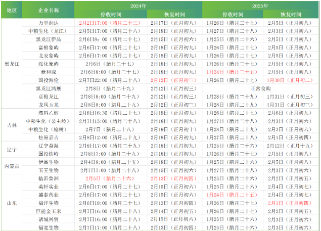 按照以往玉米深加工企业春节期间的安排,预计2026年2月12日(腊月二十五)左右企业开始陆续停收,2月22日(正月初六)左右开始恢复正常收购;极少企业春节期间正常收购。