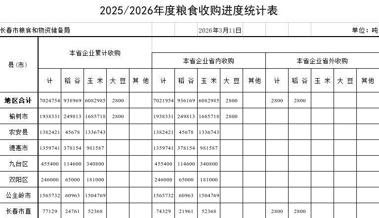 长春市粮食收购进度及价格信息(2026年3月13日)