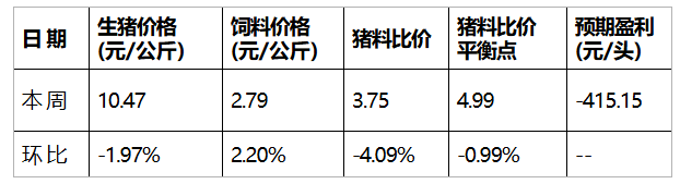 本周全国猪料比价为3.75,环比下跌4.09%。按目前价格及成本推算,未来仔猪育肥模式的生猪养殖头均盈利为-415.15元。本周生猪均价环比下滑。中大型养殖企业继续加速出栏,但终端市场需求平淡,且屠宰企业冻品入库及二次育肥补栏均维持谨慎,需求消化能力有限,供大于求带动生猪价格继续下跌。目前散户对低价销售已经产生抵触情绪,未来一周大型养殖场减重出栏速度或放缓,且屠宰企业已有低价补库迹象,猪价继续下跌空间不大,或维持低位震荡运行,预计下周生猪均价或环比仍下滑,养殖预期盈利或继续减少。