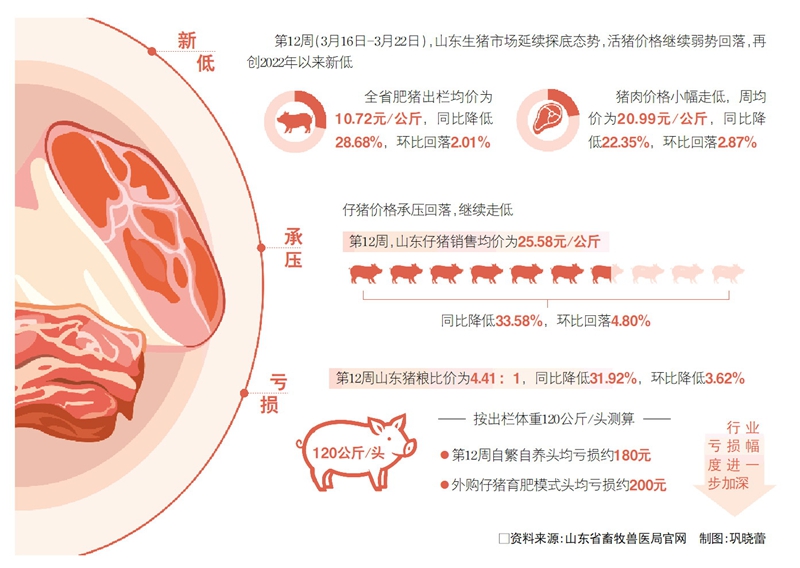 根据山东省畜牧兽医局3月25日发布的《第12周山东省畜产品市场行情分析》,3月16日—3月22日猪肉均价为10.5元/斤,同比下降22.35%,环比回落2.87%。这已经是猪肉价格春节后连续第六周下跌。