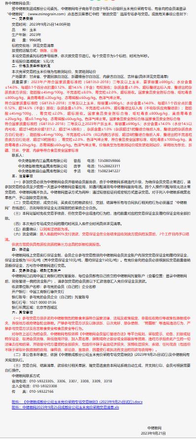 9月25日中储粮成都公司玉米竞价采购专场公告