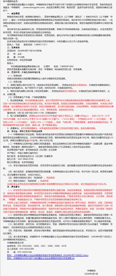 2024年6月11日中储粮新疆分公司玉米购销双向竞价交易专场公告