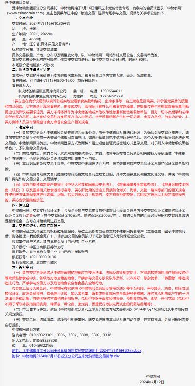 2024年7月16日中储粮浙江分公司玉米竞价销售专场公告