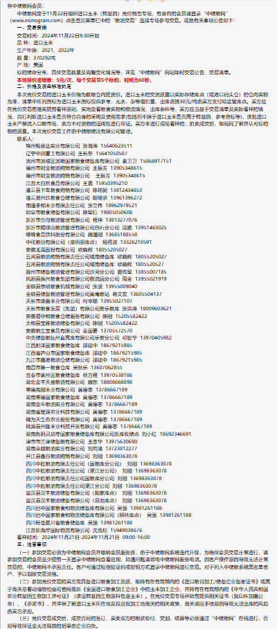 2024年11月22日中储粮进口玉米(转基因)竞价销售专场公告