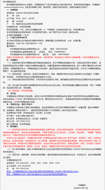 2024年12月20日中储粮内蒙古分公司玉米竞价销售专场公告