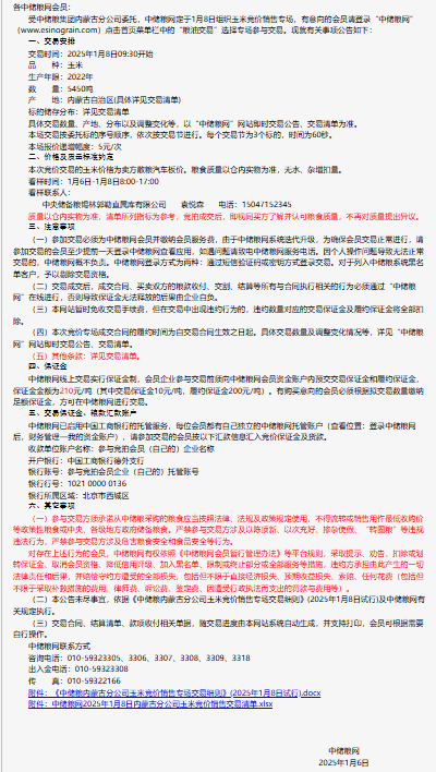 2025年1月8日中储粮内蒙古分公司玉米竞价销售专场公告