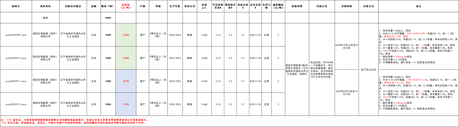 受国投生物能源(铁岭)有限公司委托,江苏粮油商品交易市场暨玉米分中心定于2025年9月29日 13:30 在“玉米分中心竞价采购交易专场”举办本次玉米竞价采购交易活动。具体事宜公告如下: