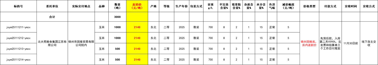 受北大荒粮食集团江苏有限公司委托,江苏粮油商品交易市场暨玉米分中心定于2025年11月12日9:00至11月14日15:00,在“玉米分中心挂牌采购专场”举办本次玉米挂牌采购交易活动。