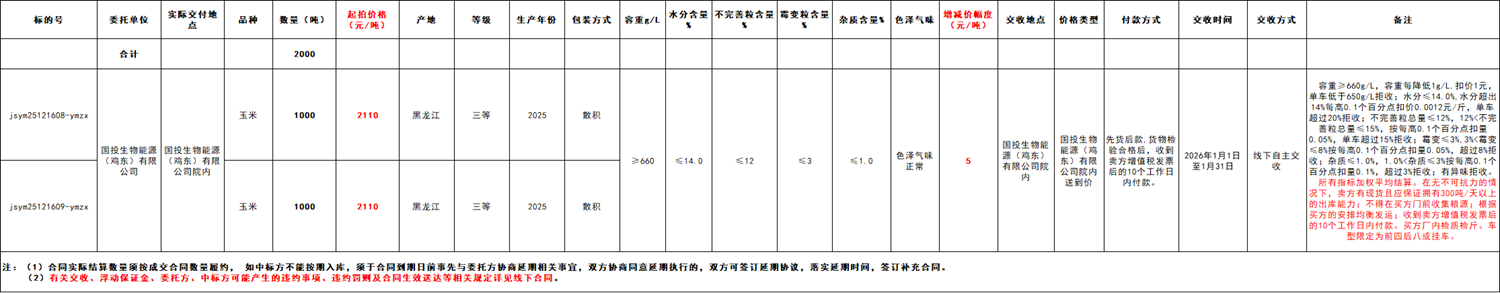 受国投生物能源(鸡东)有限公司委托,江苏粮油商品交易市场暨玉米分中心定于2025年12月16日14:00在“玉米分中心竞价采购交易专场”举办本次玉米竞价采购交易活动。具体事宜公告如下: