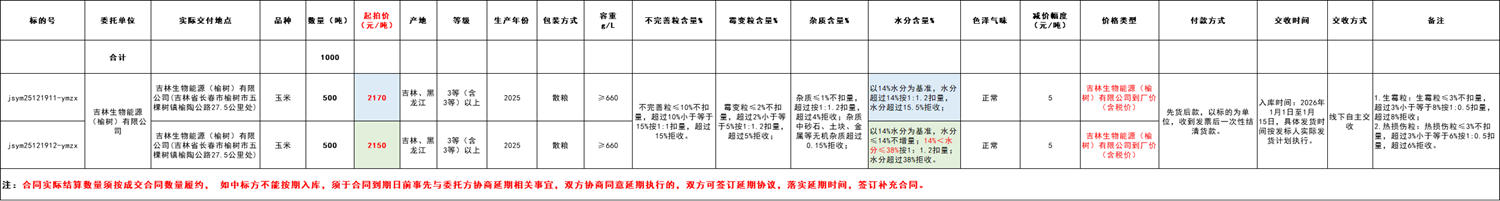 2.本次竞价采购交易起拍价:详见交易清单,竞价幅度为人民币5元/吨。交易价格类型为吉林生物能源(榆树)有限公司送到价。
