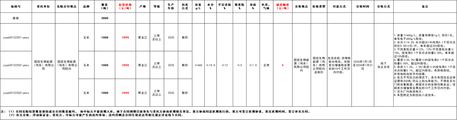 受国投生物能源(鸡东)有限公司委托,江苏粮油商品交易市场暨玉米分中心定于2025年12月22日14:00在“玉米分中心竞价采购交易专场”举办本次玉米竞价采购交易活动。具体事宜公告如下: