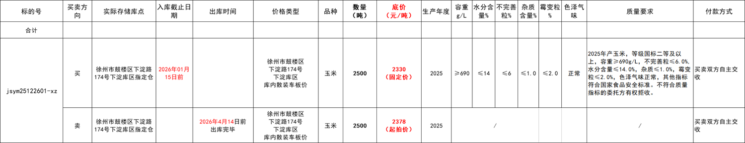 销售的粮食为本次采购的粮食在未来时点销售的粮食,出库价格为本次竞价产生,交易底价为仓库车板价:2378元/吨(2026年4月14日前出库完毕)(具体参见交易清单)。