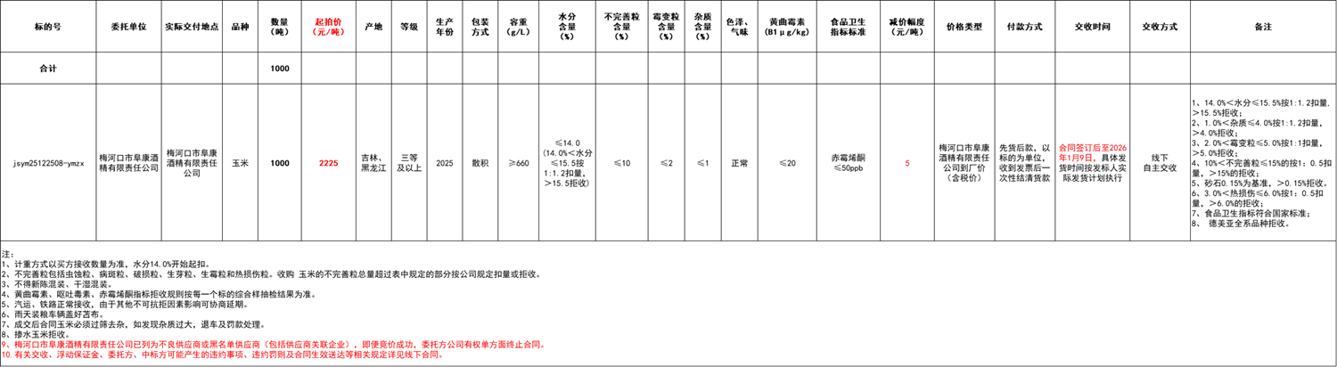 2.本次竞价采购交易起拍价:2225元/吨,竞拍减价幅度为人民币5元/吨。交易价格类型为梅河口市阜康酒精有限责任公司到厂价格(含税)。