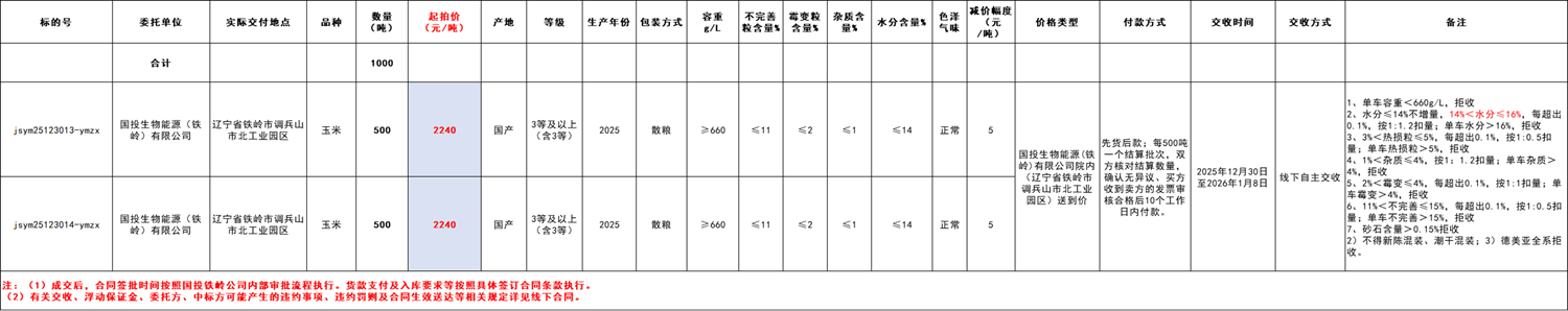 受国投生物能源(铁岭)有限公司委托,江苏粮油商品交易市场暨玉米分中心定于2025年12月30日 13:30 在“玉米分中心竞价采购交易专场”举办本次玉米竞价采购交易活动。具体事宜公告如下: