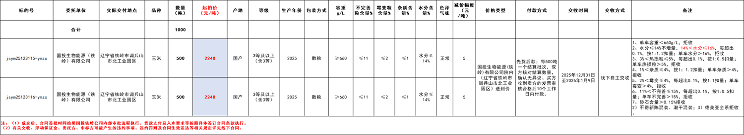 受国投生物能源(铁岭)有限公司委托,江苏粮油商品交易市场暨玉米分中心定于2025年12月31日 13:30 在“玉米分中心竞价采购交易专场”举办本次玉米竞价采购交易活动。具体事宜公告如下: