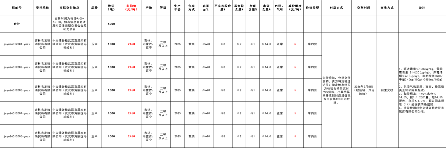 采购价格:本次挂牌采购交易起拍价为2450元/吨,竞拍幅度为人民币5元/吨。交易价格类型为中央储备粮武汉直属库有限公司(武汉市黄陂区冯树岭村)库内价。