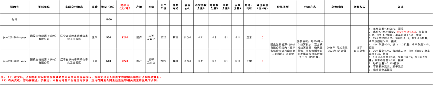 受国投生物能源(铁岭)有限公司委托,江苏粮油商品交易市场暨玉米分中心定于2026年1月20日 13:30 在“玉米分中心竞价采购交易专场”举办本次玉米竞价采购交易活动。具体事宜公告如下: