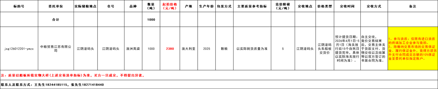 受中粮贸易江苏有限公司委托,江苏粮油商品交易市场暨玉米分中心定于2026年1月22日 11:00 在“玉米分中心竞价销售交易专场”举办本次高粱竞价销售交易活动。具体事宜公告如下: