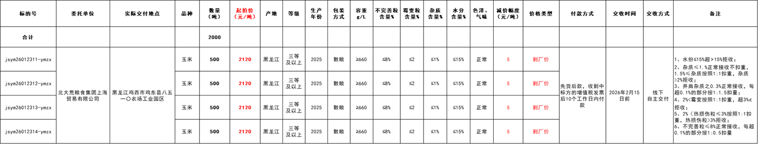 受北大荒粮食集团上海贸易有限公司委托,江苏粮油商品交易市场暨玉米分中心定于2026年1月23日 14:15 在“玉米分中心竞价采购交易专场”举办本次玉米竞价采购交易活动。具体事宜公告如下: