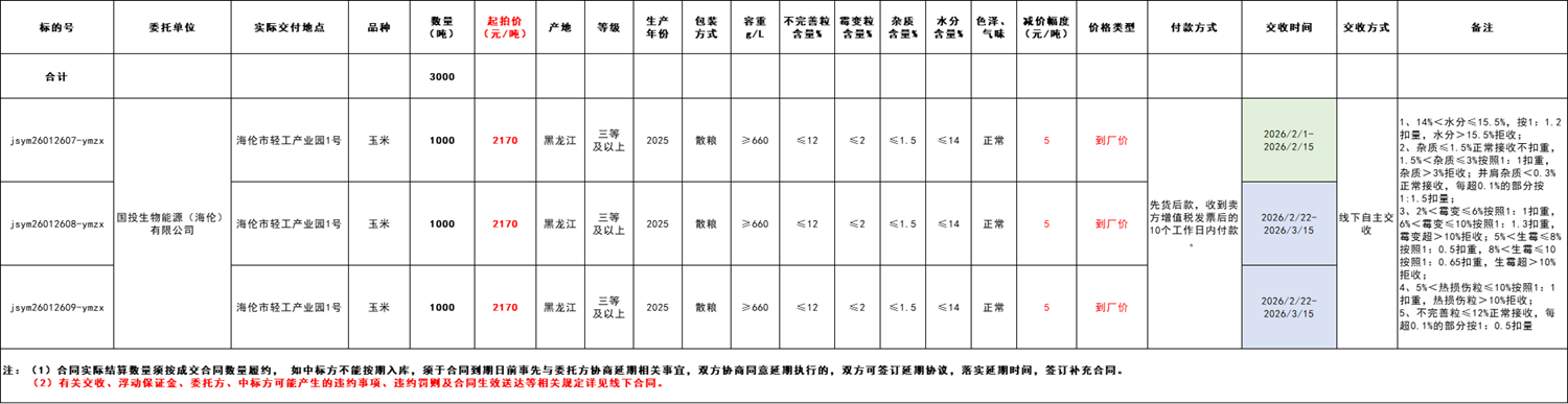 受国投生物能源(海伦)有限公司委托,江苏粮油商品交易市场暨玉米分中心定于2026年1月26日 14:30 在“玉米分中心竞价采购交易专场”举办本次玉米竞价采购交易活动。具体事宜公告如下: