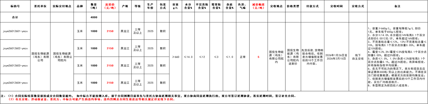 受国投生物能源(鸡东)有限公司委托,江苏粮油商品交易市场暨玉米分中心定于2026年1月26日 14:00在“玉米分中心竞价采购交易专场”举办本次玉米竞价采购交易活动。具体事宜公告如下:
