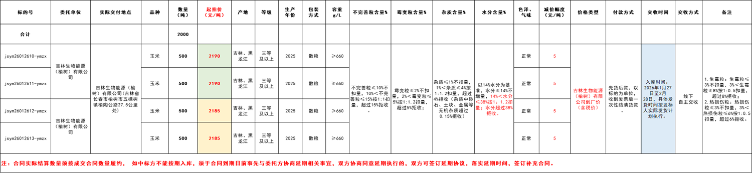 2.本次竞价采购交易起拍价:详见交易清单,竞价幅度为人民币5元/吨。交易价格类型为吉林生物能源(榆树)有限公司送到价。
