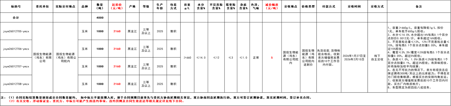 受国投生物能源(鸡东)有限公司委托,江苏粮油商品交易市场暨玉米分中心定于2026年1月27日14:00在“玉米分中心竞价采购交易专场”举办本次玉米竞价采购交易活动。具体事宜公告如下:
