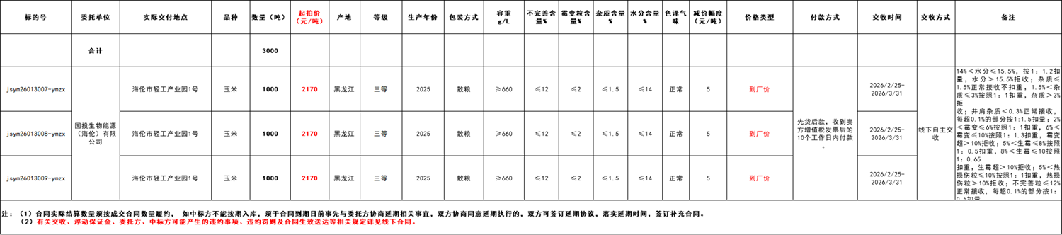 受国投生物能源(海伦)有限公司委托,江苏粮油商品交易市场暨玉米分中心定于2026年1月30日14:30 在“玉米分中心竞价采购交易专场”举办本次玉米竞价采购交易活动。具体事宜公告如下: